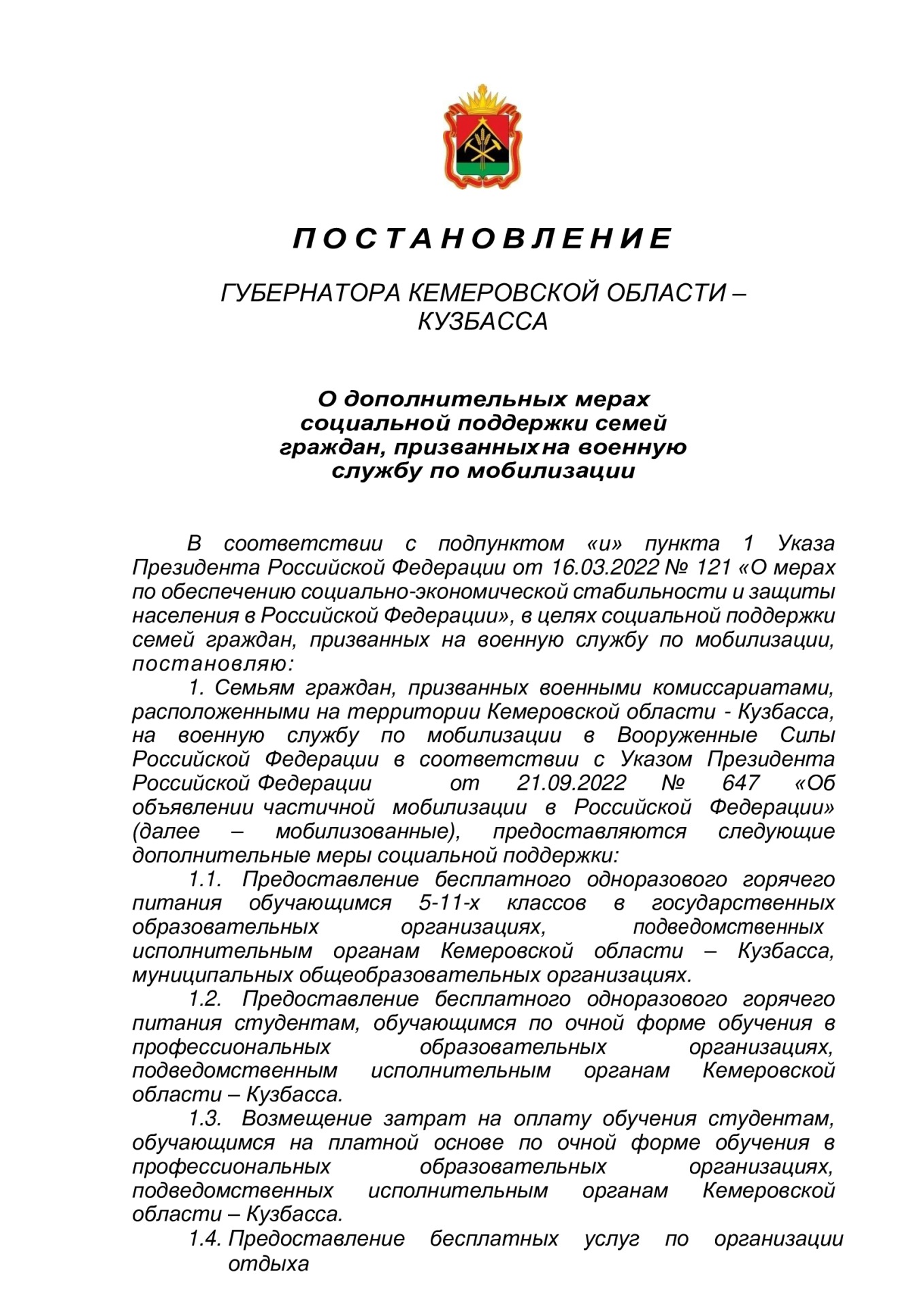 П О С Т А Н О В Л Е Н И Е ГУБЕРНАТОРА КЕМЕРОВСКОЙ ОБЛАСТИ – КУЗБАССА